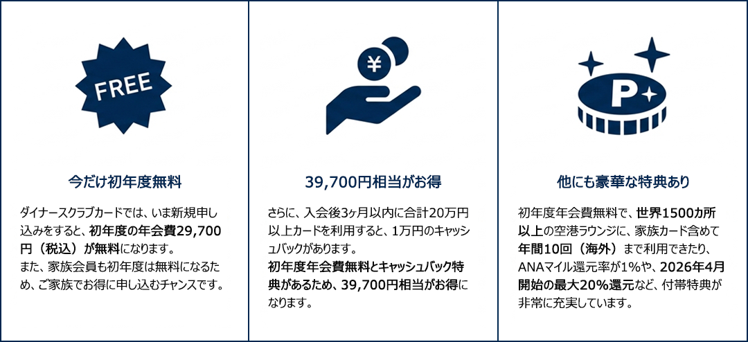 ダイナースクラブでは、新規入会の方を対象とした特別な優待キャンペーンが随時実施されています。